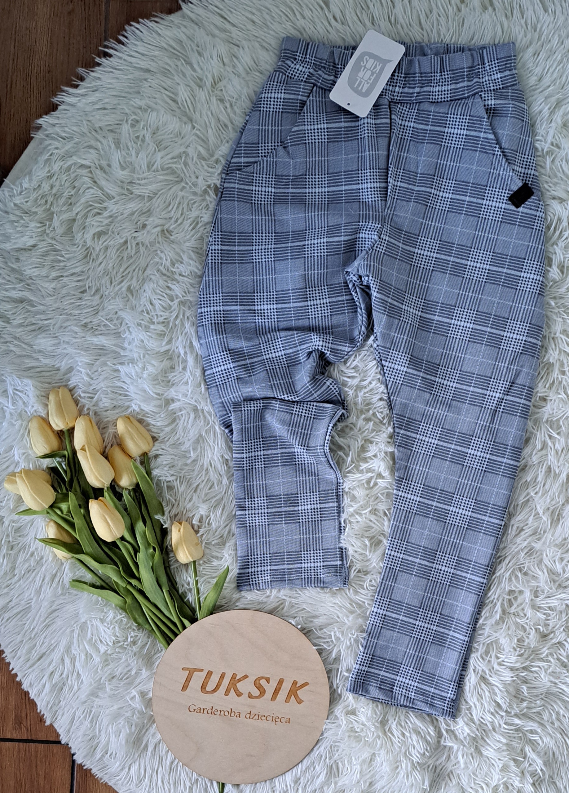 Dzianinowe spodnie w szaro-błękitną kratę.