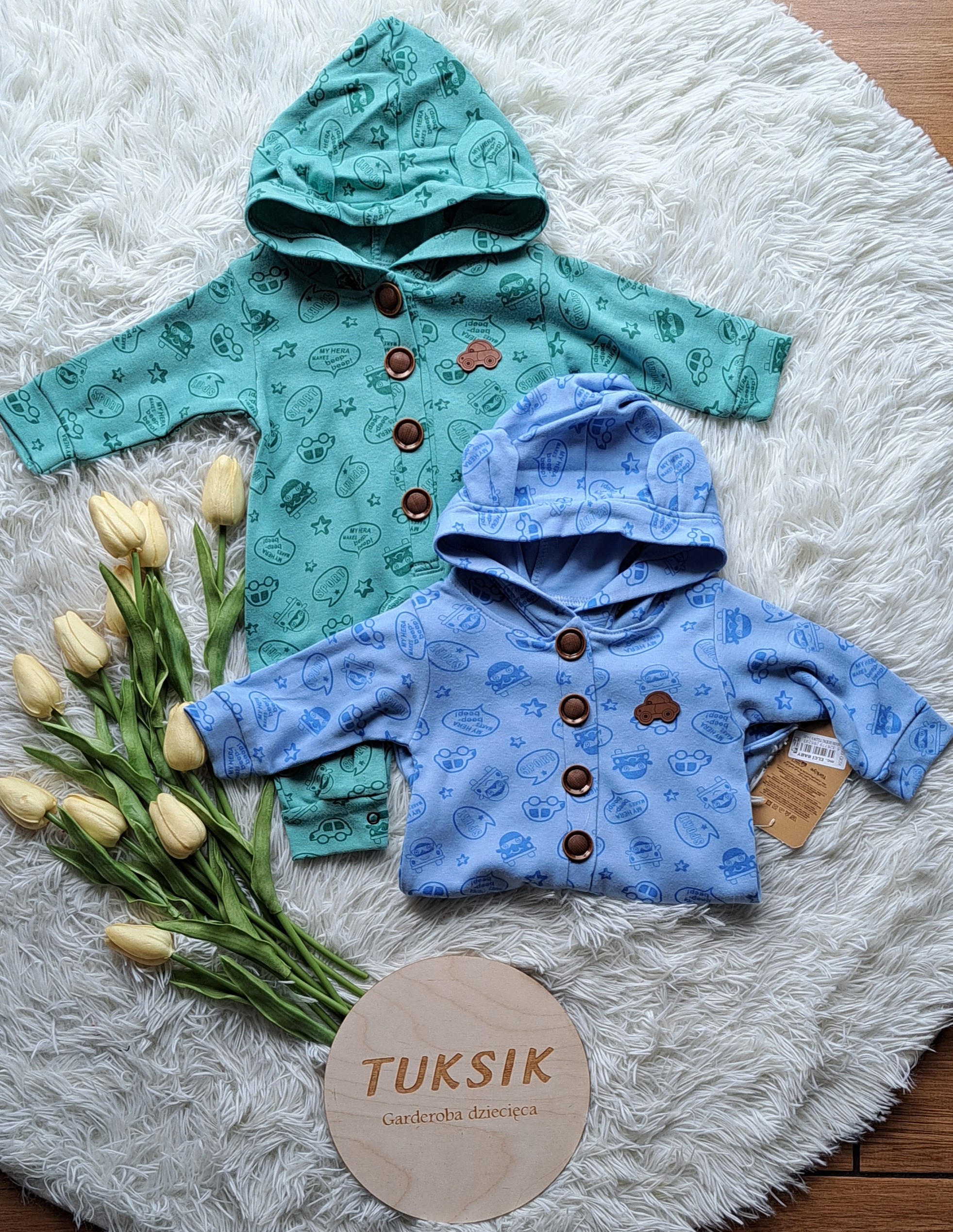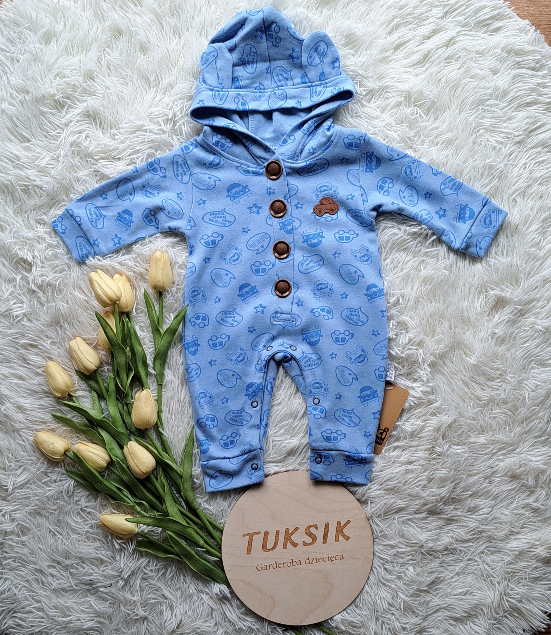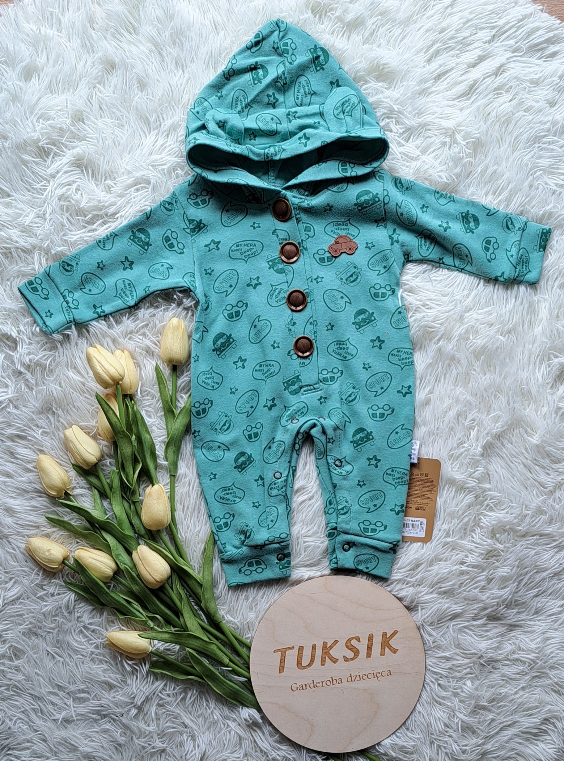 Bawełniany pajac z odkrytymi stópkami i z kapturem. Cyfrowy nadruk. Dekoracyjne, akcentujące guziczki w brązie. Miękki i wygodny, nie krępuje ruchów maluszka.